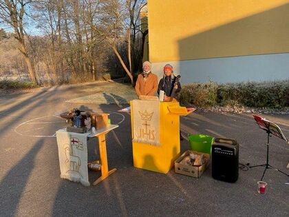 "Dank" der Pandemie kam die Idee auf, für die Kinder einen Weihnachtsgottesdienst im Freien zu gestalten. Die Andacht wurde klassenstufenweise auf dem Schulhof bei klirrender Kälte und Sonnenschein durchgeführt. Sogar der Mond war noch in voller Größe am Himmel zu sehen, die Gitarre mit Raureif versehen. Vor dieser Kulisse, begleitet durch das Gitarrenspiel von Frau Berhalter, unterstützt durch Herrn Häge, Referendar im Vikariat, sangen die Kinder „Wir sagen euch an den lieben Advent“ und „Ihr Kinderlein kommet“. Die Klassenlehrerinnen zündeten eine Wunderkerze an, um das Wunder dieser Kerze zu demonstrieren, das darin besteht, dass sie sich nach dem Anzünden nicht mehr auslöschen lässt. Am Ende erhielten alle Kinder eine Wunderkerze mit auf den Weg. Wir wünschen auf diesem Weg Allen nochmals schöne Ferien.