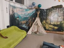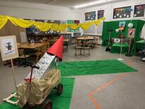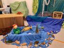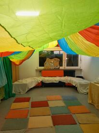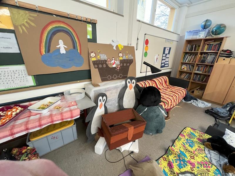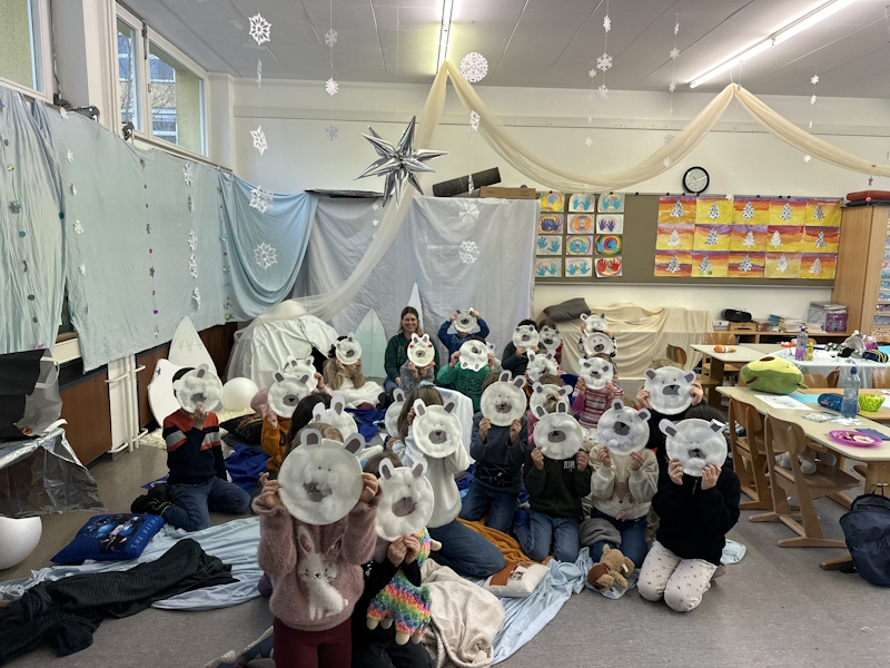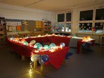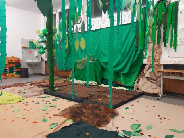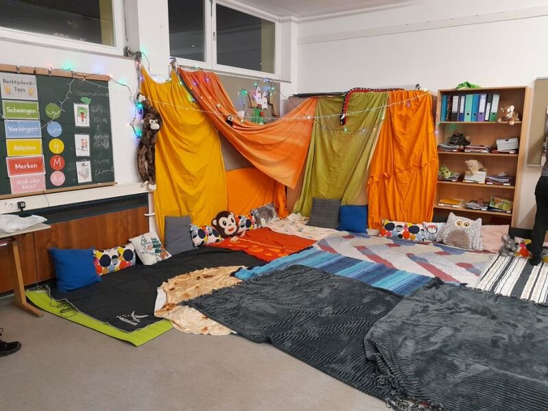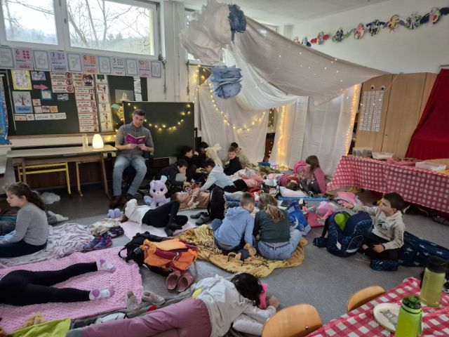 Bereits am vergangenen Donnerstag waren die Klassenzimmer der Lützelbachschule abends hell erleuchtet. Emsig rückten die Eltern unserer Schülerinnen und Schüler Tische und Stühle beiseite. Mit Tüchern, Decken, Planen und Unmengen an vorbereiteten Dekorationen wurden die Schulräume zu Höhlen, Teichen, Müllhalden oder Bienenstöcken umgestaltet. Bastelmaterialien wurden vorbereitet und Kuschelecken eingerichtet. Die Eltern der Dekorationsteams hatten offenbar keine Mühen gescheut und mit viel Aufwand und Kreativität, den Kindern eine besondere literarische Welt erschaffen. Die Kinder kamen am Freitagmorgen erwartungsvoll, viele auch mit sichtlicher Aufregung und Vorfreude, in die Schule, gespannt darauf was sich hinter der Klassenzimmertür wohl verbergen würde. Andächtig wurden die „literarischen Reiche“ betreten, die teilweise durch Lichterketten in schummriges Licht gehüllt waren. Der Vormittag war thematisch an die jeweilige Lektüre angepasst. Die Eltern der Klasse 2c hatten das Buch „Und plötzlich war Frau Honig da“ ausgewählt. Dank des Bastelteams durften die Kinder aus Perlen und Stoffflügelchen Bienen-Lesezeichen herstellen, sich am Bienen-Buffet mit Bienenkeksen, Bienenwürstchen oder Bienenmuffins stärken und natürlich der Geschichte von Frau Honig lauschen, die von den Müttern des Vorleseteams gelesen wurde. Obendrein durfte jedes Kind am Ende des Vormittags ein Honiggläschen mit Honiglöffel mit nach Hause nehmen. Den Kindern hatte es Frau Honig offenbar „angetan“, denn einige der Zweitklässler hatten sich bereits am Wochenende das Buch besorgt um zu erfahren, wie die Geschichte weitergeht. Im Raum der 1b war ein Teich gestaltet worden, denn dort war der „Kleine Wassermann“ zu Gast. Es gab unter anderem köstliche Bananen-Delfine in Heidelbeerwasser, Käsefische und Blätterteigtaschen mit Algen am Buffet.(wobei letztere als süße Gummischnüre ausgeführt waren). Bei der 1a konnten die Kinder im Prinzessinnenschloss, beziehungsweise in der Piratenhöhle Platz nehmen, sich wahlweise im eigens angefertigten, lebensgroßen Pappaufsteller ablichten lassen und passend zum Buch „Prinzessinnenjunge und Seeräubermädchen“ Fernrohre und Krönchen basteln. Vielen Dank an die vielen Eltern und Großeltern die sich mit viel Aufwand in den Dekorationsteams, Vorleseteams , Bastelteams und bei der liebevollen Vorbereitung der leckeren Buffets beteiligt haben! Bereits seit dem letzten Schuljahr nimmt die Lützelbachschule an dem Programm BiSS (Bildung in Sprache und Schrift) teil. Ein Schwerpunkt ist die Förderung der Lesekompetenz unserer Schülerinnen und Schüler. In festen Lesezeiten lernen die Schüler beispielsweise durch sogenannte „Lautlesetandems“ ihre Leseflüssigkeit zu verbessern. Dies ist eine wichtige Voraussetzung um sinnentnehmend, also verstehend lesen zu können. Die Motivation sich mit Literatur zu beschäftigen, Bücher als etwas Spannendes anzusehen, bei deren Lektüre Kinder in phantastische Welten eintauchen oder sich mit den Gedanken und Gefühlen anderer auseinandersetzen können, wird durch Schulprojekte wie den Vorlesetag gefördert.